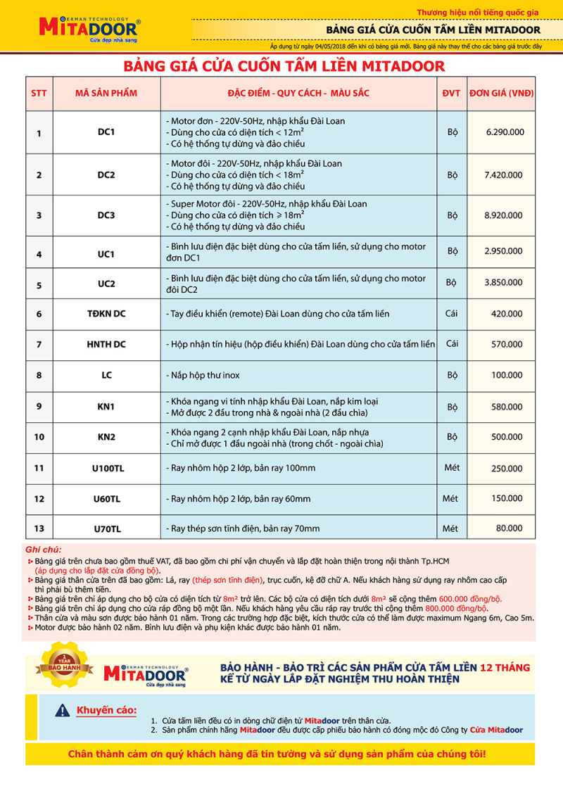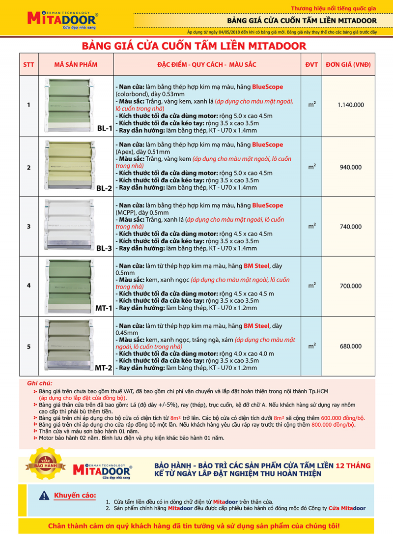 Thông tin bảo hành Cửa cuốn Tấm liền Mitadoor – BL2